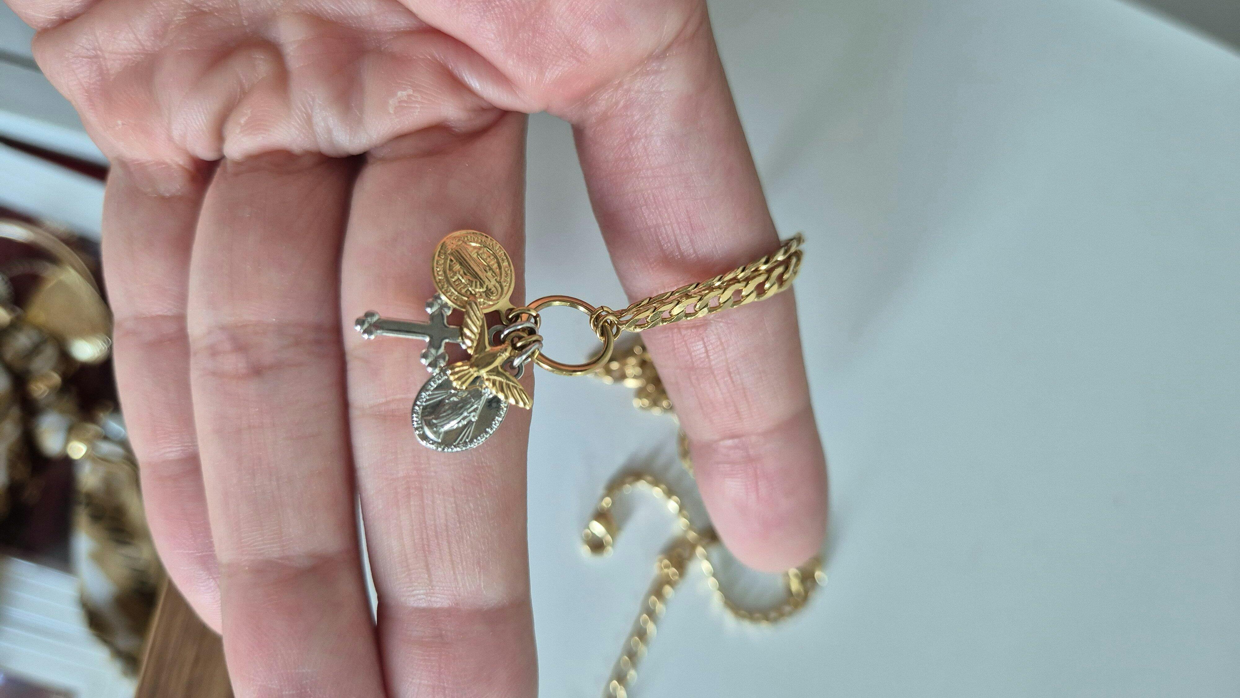Colar banhado a ouro 18k com mix de pingentes Divino, Cruz, Medalha Milagrosa.